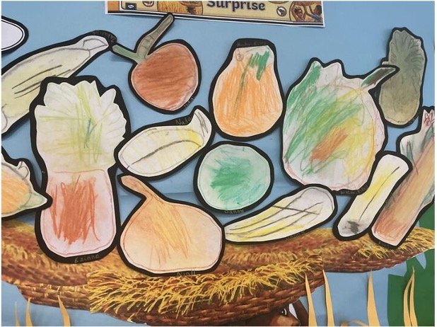 The children in Reception used pencils to draw the outline of their fruit from their core book Handa’s Surprise. Then the children used pastels to colour in and shade their fruit. Finally, the children explored the technique of smudging the pastels to add a softer colour to their drawings.
