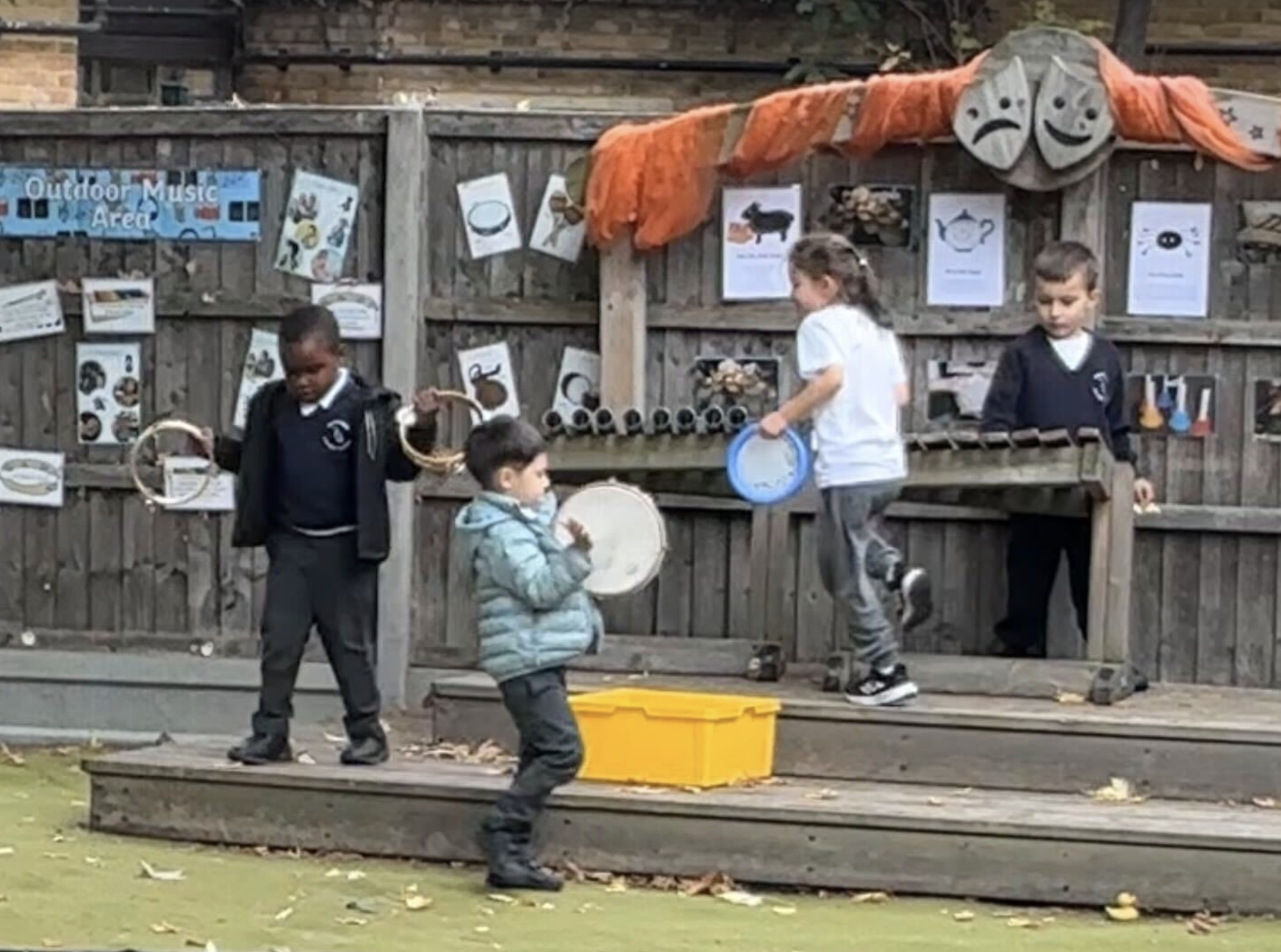 In Reception, the children enjoy choosing their own instruments in the outside music area as part of our continuous provision. They sing known songs and make up their own, developing a sense of pitch and rhythm both independently and in collaboration with others.
