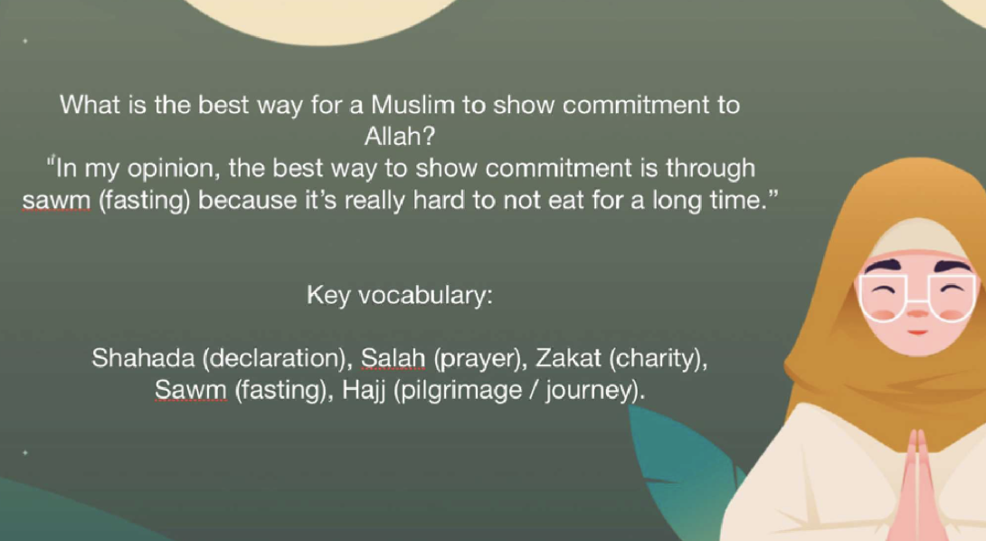 In Year 5, the children reflected upon their learning of the five pillars of Islam and discussed which pillar they considered to show a Muslim’s greatest commitment to Allah. We also presented our learning to parents and the school during both KS1 and KS2 during the Ramadan period.