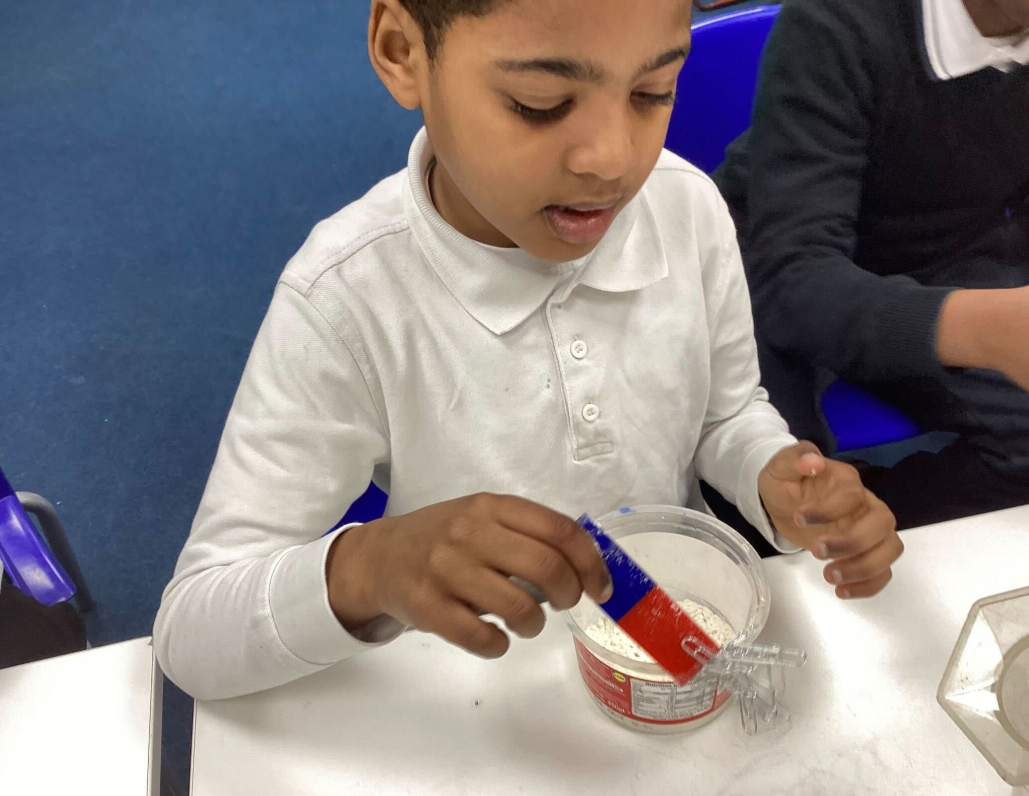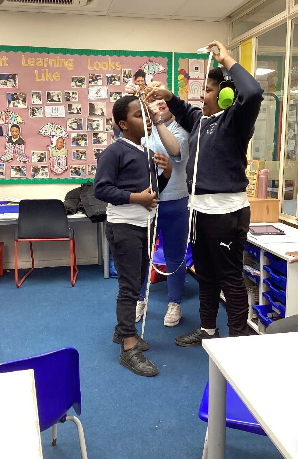 The upper KS2 children are learning about height and exploring using tape measures to measure each other and compare heights.