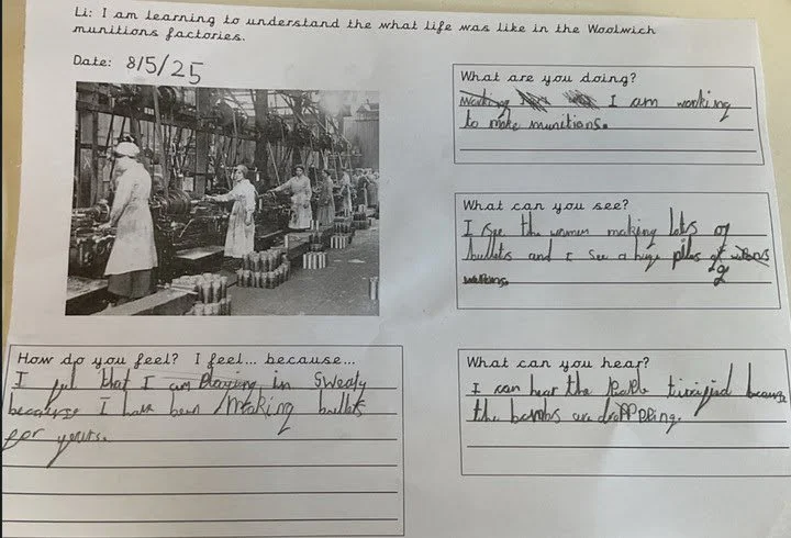 In Year 2’s topic of Wonderful Woolwich, we found out about the lives of female munitions workers in Woolwich working at the Royal Arsenal munitions factory. We ‘jumped into a picture’ and imagined being there at that time and what they might have seen, felt and heard. We discussed the significance of the vital role that these women played in our national and local history.